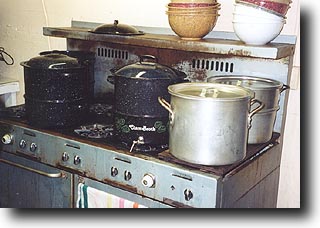 They are perhaps a uniquely New England tradition. If they are common elsewhere around the country, I am not aware of it. I am talking, of course, about the custom common in New England of sitting down to a family-style meal of baked beans and the fixin's. Sure, you can find baked beans all up and down the east coast, and into the midwest as well - but as a side dish, not as the main course! It is hard to place where or when this custom began. One story claims that bean suppers began around the time of the American Revolution, to honor Washington's troops at Valley Forge who only had beans and sausages to eat. That seems a little far-fetched, and I've never heard anyone stand up at a bean supper and propose a moment of silence to honor George's brave boys in mufti and frozen feet. Another story has baked beans starting with the pilgrims, when cooking on the Sabbath was prohibited. The beans and Brown Bread were baked the night before, then heated to piping hot the next day. Of course, some folks traditionally have baked beans for Saturday night supper, so I don't know how that all fits. Perhaps the baked bean custom simply began as a good, practical Yankee way of making a little go a long way. In these rock-bound hills in New England it would be out of character to have an ox roast, or to barbeque up a mess of ribs, or to have a chili cook-off. Can you see Calvin Coolidge at the end of the banquet table carving up a steamship round of roast beef? Not hardly. But beans - everyone grows them, they are cheap and plentiful, and a whole meal can be made for a few pennies. A supper of beans is no stranger than having baked beans for breakfast - which a lot of New Englanders still do. In the best diners in New England you can buy a side of baked beans, served in a little brown pot. Now of course, these beans probably are out of a can rather than being cooked the proper way, but the thought is still there. Some cook whose name has been lost to time was probably the first person to try cooking beans with molasses for a different taste. The Boston Online FAQ says beans slow-baked in molasses have been a favorite Boston dish since colonial days, when the city was "awash in molasses" due to its rum-producing role in the "triangular trade." Sugar cane harvested by slaves in the West Indies was shipped to Boston to be made into rum to be sent to West Africa to buy more slaves to send to the West Indies. Even after slavery's end, Boston continued to be a big rum-producing city. The Great Molasses Flood of 1919, which killed 21 and injured 150, occurred when a tank holding molasses for rum production exploded. Beans baked in molasses continue to be popular in New England despite the accident, however.