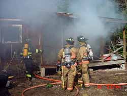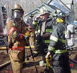 As the first tank truck arrived we set the folding canvas water tank up and kept it filled from a series of tank trucks shuttling water between the fire scene and a fill site established at the Nason's Beach boar ramp. Central Maine Power was soon on the scene to cut the power to the house and remove that hazard to fire fighting efforts. Mutual aid crews of fire fighters and apparatus kept arriving in a steady stream, from Naples, Standish, Bridgton, Baldwin, and Casco. Fire fighters attacked the fire with 2 ½" and 1 ¾" hand lines, and soon had it under control. The aerial tower from Standish fire fighters arrived on scene and fire fighters used it to vent the metal roof. While all this was happening neighbors were wetting down their roofs with garden hoses, and the propane bottles on the camper parked at the side of the house began venting and caught fire. The camper itself began to burn. With a great deal of effort, however, none of the surrounding homes or outbuildings was damaged. The fire left the home completely gutted, with only a shell standing. The cause of the fire is still under investigation by the Fire Marshall. The family lost everything in the fire. The American Red Cross put the family up at a hotel from Saturday through Tuesday, and issued them vouchers for new clothes, food, and helped them in replacing prescriptions. They also put the family in touch with service providers to help them through the next, difficult weeks. Donations to help this family in need can be made to the American Red Cross at 2401 Congress Street, Portland, ME 04102 care of the Randy Richardson Local Fire Disaster Relief Fund. For more information on donations, please call Fiona Fanning, Director of Emergency Services at the Red Cross at (207) 874-1192. Last updated May 16, 2005