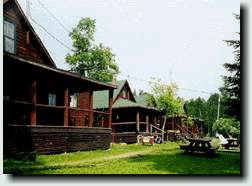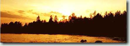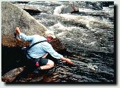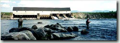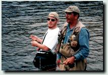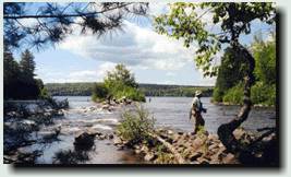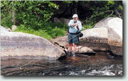 The next morning we're back at the Magalloway fishing three pools further downstream, closer to Wilson Mills. Lee nets two fine salmon using one of Jack's dead smelt flies - one is about 19" and the other about 17". Both were in the 2-3 pound range, The first one had been striking at Scott's strike indicator, and he said to Lee "Here, try that dead smelt fly in at the upper end of this pool - there's a nice salmon feeding. You'd catch him in 10 casts!" Well, it took 20 casts, but it proved to all of us that Jack's funny flies would work. Scott lands a nice 17" salmon and a 17" brookie on beadhead caddis nymph as a dropper behind a large weighted stone fly nymph. Rapid River The Lakewood Camps is one of the oldest traditional sporting camps in Maine, having been in operation for 150 years. They are located at Middledam on Richardson Lake at the head of the Rapid River. The Camps are reached by boat from Upper Arm on Richardson Lake, and Eric meets us with the camp boat about 9:00 am on Wednesday for the five mile trip. Sue Milton, one of the owners, is at the dock and shows us to our cabin for the next three days. She answers our questions about local fly patterns and points us toward the river. The dam is releasing 1,200cfs into the Rapid, so some stretches along the river are not easily fishable. However the pool below the dam, and the Pond in the River is very productive.