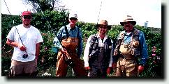 All the way across country, he'd been lucky enough to be seated next to a very attractive lady angler, who was going fly fishing in Alaska this summer. And, she wanted to talk fishing and Alaska. The triple good fortune of being able to talk fishing and Alaska with a good looking,interesting woman for 3 1/2 hours was just about more than Lee could stand! By the time Scott's plane landed from San Francisco an hour later, Lee had come back to earth himself, and we headed out for the Farmhouse and our trip to catch some big brook trout and salmon in Maine. On behind the Jeep I had a trailer piled with the first load of boxes of our protracted move from Clifton Park. The Farmhouse was in good shape when we arrived, although the grass was a bit high and needs mowing. The stone walls and edges are alive in color from flowers that we didn't know were there! A lot of love and care have gone into the plantings around the place by the former owners. The Bats have returned - into the house! I was showing Lee and Scott around the place. When we got to the Bat Room, Lee said "What's that noise?" We all listened - "Squeak, squeak - rustle, rustle" "The bats have returned," I said, "and they're inside the house!" Sure enough, there were several bats hanging from the ridge beams in the Bat Room. We later found a couple more in the Carriage House. So much for our bat-proofing efforts! The bat houses, by the way, remain empty! ...but we're going fishing anyway! We could have dealt with the bats right then - figuring out how they are getting in, and building some one-way openings so they could leave but not return. Yup, we could have, but we decided to go fishing instead. Besides, they'll only stay the summer, and will be gone to their bat hibernacula in September. Compared to the risk of missing the early caddis hatch on the Rapid River if we did postpone the fishing trip to deal with the bats, there was really no discussion nor debate. Bad news - Jack calls and confirms that he can't join us on the Rapid - it's hell when work gets in the way of fishing! He offers to take us for stripers on the coast when we get back on Saturday, however. "Do you still have those dead smelt flies made out of quills and soda straws? And the bomber flies that look like dog turds?" I ask "Sure do - want to use em?" Jack says "We'll drop by on our way north on Sunday and pick them up if that will work with you." "Why don't you come in time for breakfast and we'll feed you too." he offers We're an easy sell, and are at Jack and Ellen's doorstep in Parsonfield at 8:30am Sunday morning. They stuff us with apple pancakes and caribou sausage, and Jack passes along tips for fishing the Rapid River and the other spots where we are heading. He loans us the collection of very strange looking home-made flies guaranteed to "knock em dead" on the Rapid. We leave with plans to meet early Saturday for stripers on the coast.