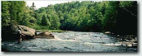 Seth is a senior in Environmental Science at the University of Maine, Farmington, and has the dream job of being paid to be on the Magalloway all summer doing an angler survey. He finds us spread out down the river, and wants to know what we're catching, where we're from, how long we are going to be fishing, etc. In turn, Scott pumps him for fishing tips and directions to the local waters, what insects are hatching, what fly patterns are working, and where to get access to several local rivers. What he doesn't tell us is that all three of the restaurants in Errol close at 8:00pm - and we're on the river till dark. Supper comes from the Irving gas station and deli in downtown Errol. "We'll take all your chicken fingers and chicken nuggets and fish sticks" says Lee to the gal behind the counter "and the curley fries too." "Sure, anything else?" she says (thinking to herself that she was just about to throw the whole batch out anyway, it being closing time). Supper is cold fried fast food and a warm Moxie at the Errol Motel - but it closes out our first day of fishing in Maine. It just doesn't get much better than this! Lee and I are fishless. We've fished with Scott before, however, and are neither surprised nor intimidated. We have miles of wonderful trout streams ahead of us. It was so hot today that when I peel off my neoprene waders, I am soaking wet inside - tomorrow I'll go wetwading. Lee has a new pair of breathable waders, and I envy him. Having any luck, boys? We were back on the Magalloway at 6:30am, Memorial Day, and had the river to ourselves. The three of us were working the "Two Girls" pool (so named because yesterday there were two lady flyfishers there most of the afternoon - and we don't know the local name for the pool). Scott had caught a nice 20" salmon at the head of the pool, and was fishing from a ledge across the river.