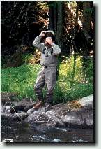 Lee was working the middle of the pool with dry flies, and with nymphs. So far he hadn't had any luck, but this is good water and it is just a matter of time, the right pattern, and maybe a hatch would help too. We were in fine spirits! From behind me comes a voice out of the bushes - "Having any luck, boys?" I turn around and see the game warden, standing right behind me, complete with binoculars and mesh bug jacket. None of us had seen or heard him come up, and he very likely had been standing there for a while watching us fish. "Let me check your license and rig" he says to me. I fumble around for my license in my bag, while he examines my nymphing setup. The Magalloway here is fly fishing only, but we do catch and release fishing anywhere we fish. Chad, the game warden, checks my season non-resident fishing license. "Did you get a Maine fishing regulations book when you got your license?" he asks "Yes, I did." I reply "Is there a problem?"