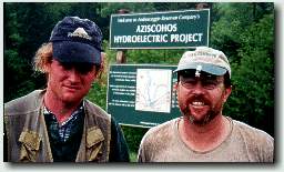 "Never mind" said Chad - "what does your license say in the upper right corner?" "$56.00" "Fine" Chad replied. We'll never know if Scott had illegal extra weight on his line or not, but he kept grinning while Chad wrote me up. When Lee came up from the lower end of the pool, his line was weightless - but Lee insists that this was the way he had it rigged all along. Chad then offered some tips and advice on where we might go fishing in the area, and answered some questions about beadheaded flies, weighted flies, and multiple flies, or droppers. As soon as Chad left, we went back to fishing - without the split-shot - and I immediately caught another brookie in the head of the pool - maybe he was right after all. In any event, he made believers of us - and a bit apprehensive if we ever hear "Having any luck, boys?" from the bushes. Rangeley River and Upper Richardson Lake Chad, the game warden, had recommended a couple of other spots to try in the area, and after catching a few more fish on the Magalloway, we drove to the Rangeley River. This is a short river, about 1 1/2 miles long, that flows between Cupsuptic Lake and Rangeley Lake. We found the snowmobile bridge that both Seth and Chad had given us directions to, and I went upstream wetwading with a beadhead pheasant tail nymph, while Lee and Scott went downstream. Lee finally broke his dry spell, and caught a number of 10-12" brookies on a small parachute Adams dry fly. Scott and I did well also. The Rangeley is my idea of a perfect type of stream - easily wadeable, with long riffles and small pocket water, with room to cast and fish. Water temperature here was also 56o F. After lunch on the patio at Oquossoc, we fish the afternoon and evening till dark below the Upperdam between Richardson Lake and Mooselookmeguntic Lake. The earth, stone and timber dams built to control water for driving logs on the rivers and lakes of this part of Maine were constructed in a similar pattern, with a long enclosed house over the gateworks. The dam at this point on Richardson Lake looks very much like the Middledam and Lowerdam on the Rapid River, where we'll be fishing in a few days. All the dams have a pool below the spillway, with salmon and brook trout attracted to the food coming down the spillway into the pool. There is generally good fishing at the pool, and at the tail of the pool, depending on what water is being released from the dam.