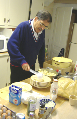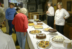 No visit to Germany or Austria is complete without spending some time in a Konditorei. These delightful coffee and pastry shops are in every town and city and are favorite destinations for walks in the country. There visitors can dawdle over a cup of Kaffee and a slice of Kuchen or a Frucht Tort while enjoying conversation with friends and neighbors. On September 23rd visitors to Bridgton filled the basement of the Bridgton United Methodist Church to enjoy some warm German gemutlichkeit at Eine Kleine Konditorei (a small café). Small tables with fresh flowers and colorful menus in German and English greeted visitors, while German music played in the background and scenes from German cities and countryside were displayed on a screen and in posters on the walls. Filling one entire end of the room was a long table laden down with German pastries including Schwarzwaelder Kirschtorte (Black Forest Cake), Kaesekuchen (cheese cake), Apfelkuchen (apple cake), Frucht Toertchen (Fruit tarts) and several other cakes and pastries. In the kitchen a crew prepared elegte Brote (open faced sandwiches), Goulaschsuppe (Goulash soup) and other authentic German cuisine. Even the coffee was imported from Germany! Every table was full and there was a long line waiting to make their pastry selection. The German night attendance exceeded expectations and the café was completely sold out of food after only two hours. Morse’s Goulash soup was a big hit, as were the cakes and pastries.