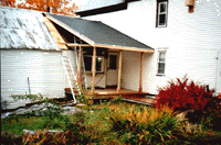 During a several day period, where he had to dodge the rainshowers, Paul removed the old roofing, put down new plywood, and installed the membrane. The proof of the pudding was the next heavy rain - even though the house was lashed with a hard, driving rain and high winds, not a drop came through the membrane. The next job to get done before winter is the installation of the rolled roofing to finish the roof - but we need a stretch of warm sunny weather to do so. Paul is hoping for an early Indian Summer this fall. The winter job will then be to pull down all of the old ceiling and insulation, re-insulate, and replace the ceiling. A jack under the corner of the barbershop will arrest any further settling. A New Farmer's Porch and Kitchen Roof I was in the kitchen last winter when we heard a loud "Rumble" from the back of the house. Looking out, I saw a big load of snow and ice slide off the house roof. When the sun hits the metal roof, the accumulation of snow loosens and slides off into the back yard. By mid winter, the snow pile is easily 3 to 4 feet deep, and the back kitchen door is unusable because of all the snow piled up against it. If the dogs or one of us were out on the back walkway when the snow slid off the roof, we could easily be seriously injured. The metal roof on the carriage house over the kitchen bay window has also been a favorite spot for our male bats to come and go from their roosting spots in the second story of the carriage house. The way that the corregated metal has been constructed over the bay window, there was no way that we could block up all the entry holes to keep the bats out. Paul and I discussed several ways to resolve both problems, and he suggested building a farmer's porch with a new roof that would protect the back kitchen door from snow slides. The new roof would run from the carriage house ridge line, to give a moderate pitch, and in the process we would remove the old metal roof on the carriage house. The new roof and soffits will have no entry holes for bats.