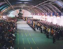 Alison got us all up at 5:00 a.m (or 0500 hours). the morning of graduation, so we wouldn't be late. There didn't seem much danger of that, since our motel was only about 10 minutes from the base. Despite six people taking turns showering and shaving in two bathrooms, we were still at the base when the gates opened at 0700. We were herded with hundreds of other parents and families to the visitor reception center at 0815 hours, where we waited until they escorted us all to a huge assembly hall. The nearly 4,000 visitors were directed to bleachers according to the unit that their sailor was graduating from - we were lost in the cavern-like space. Promptly at 0945 hours the units started marching in, accompanied by a brass marching band and flag detail. Although we knew his unit, since it was arranged with the tallest sailors in front, about all we could see of Derek way in the back during the ceremony was his right ear! And his white cap.
